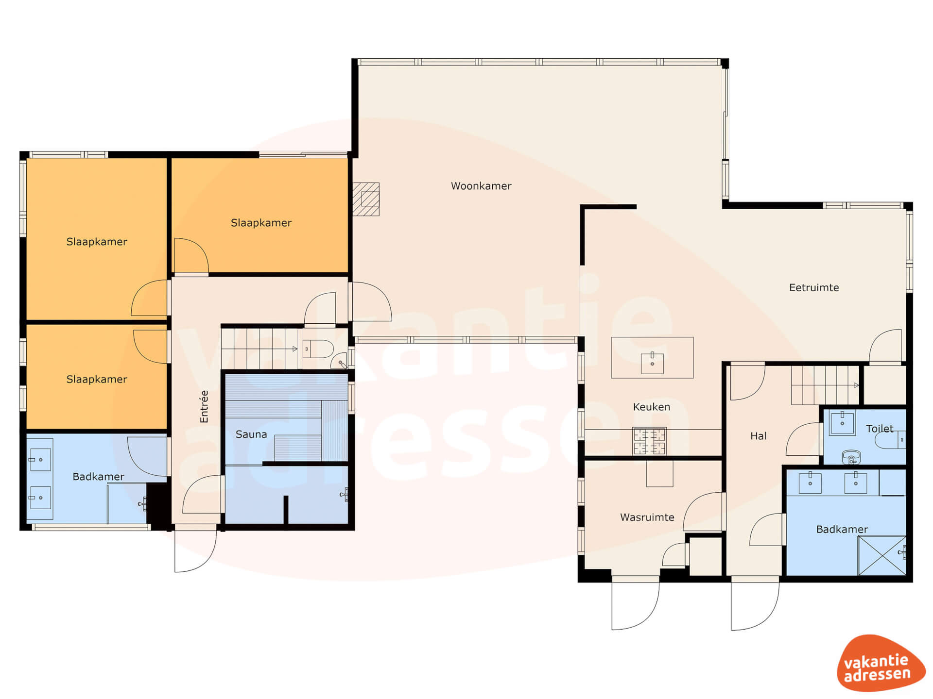 Je beschikt beneden over 2 badkamers met dubbele douches en dubbele wastafels. Alle slaapkamers zijn voorzien van royale boxspring bedden. De sauna is zowel traditioneel als stoomsauna te gebruiken. Naast de sauna bevindt zich een extra doucheruimte. Beneden vind je verder 2 losse toiletten. De accommodatie heeft geen aangepaste douche en toilet, maar is wel volledig drempelloos en voorzien van 2 badkamers beneden waar je eenvoudig met de rolstoel in kunt rijden. Eventuele hoog-laag bedden en andere voorzieningen kunnen via de thuiszorg organisatie geregeld worden.