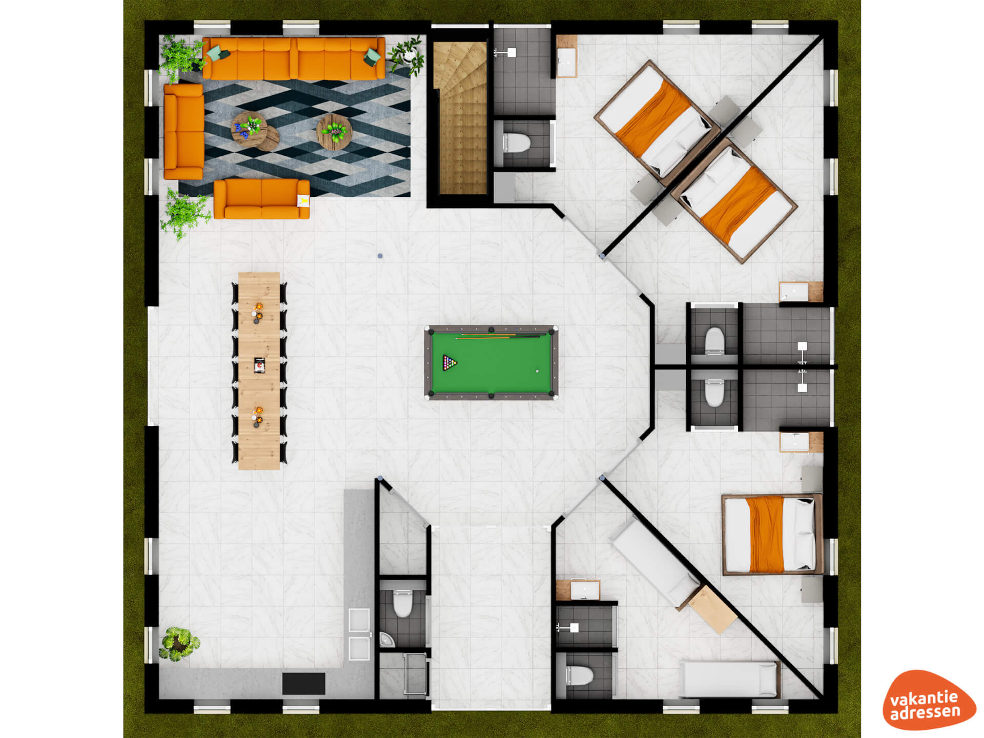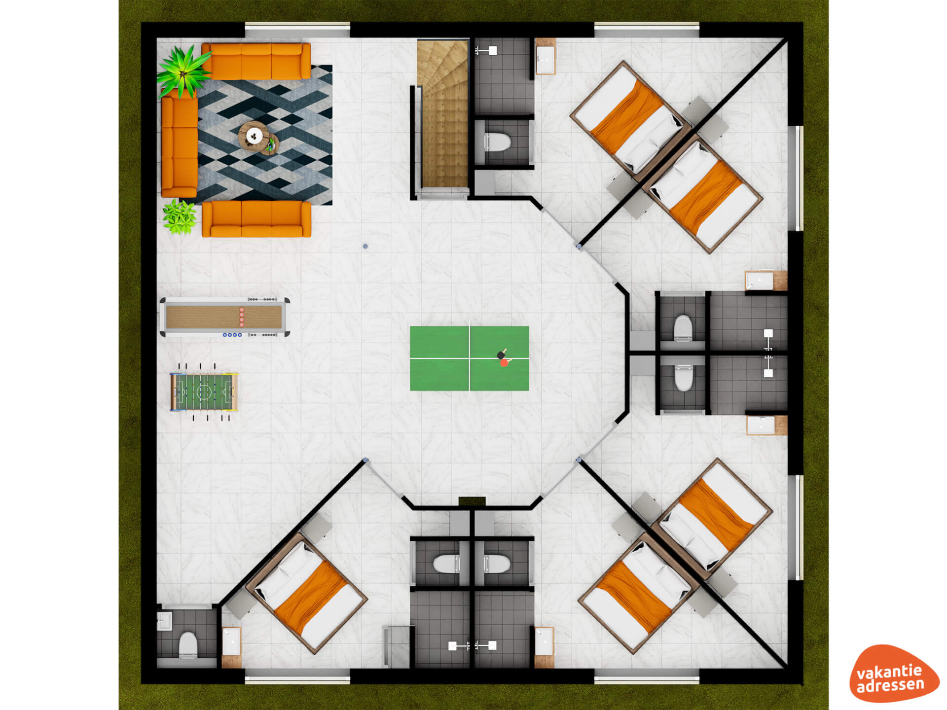 - Alle slaapkamers zijn voorzien van eigen douche, toilet en wastafel