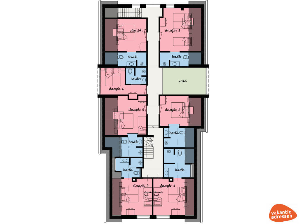 Slaapkamer 6: 2x 1-persoonsbed + 1x stapelbed + douche, toilet en wastafel