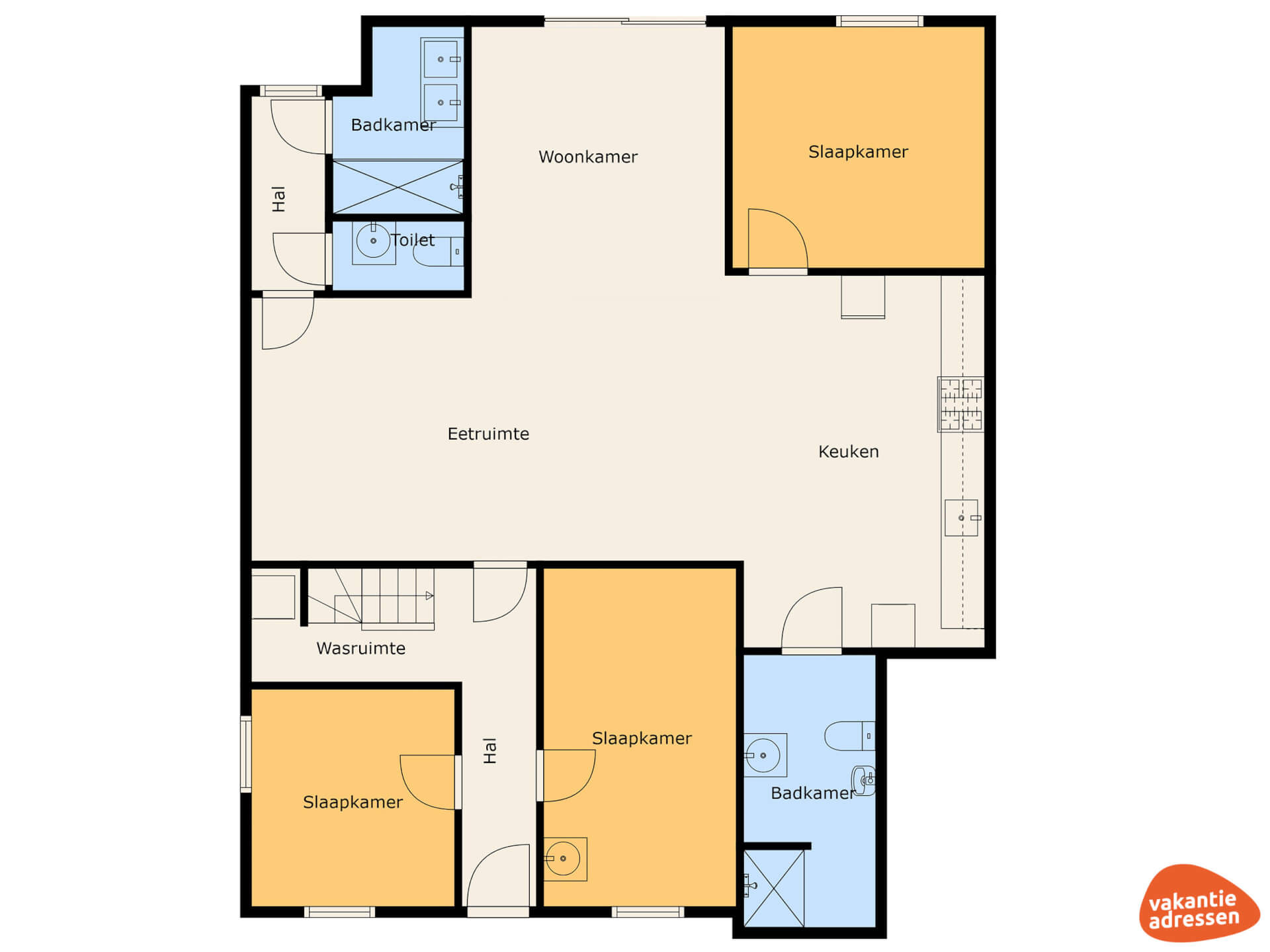 Drie van de 6 slaapkamers bevinden zich op de begane grond, elk met een 2-persoonsbed. Eén badkamer heeft een douche, toilet en wastafel, de tweede badkamer is voorzien van inloopdouche, toilet, urinoir en dubbele wastafels. De accommodatie is rolstoelvriendelijk: drempelloos op de begane grond en met aangepaste voorzieningen bij de badkamer. Op de bovenverdieping zijn 3 slaapkamers (één met een 2-persoonsbed en twee met vier 1-persoonsbedden), een aparte wasruimte en een extra toiletruimte.
