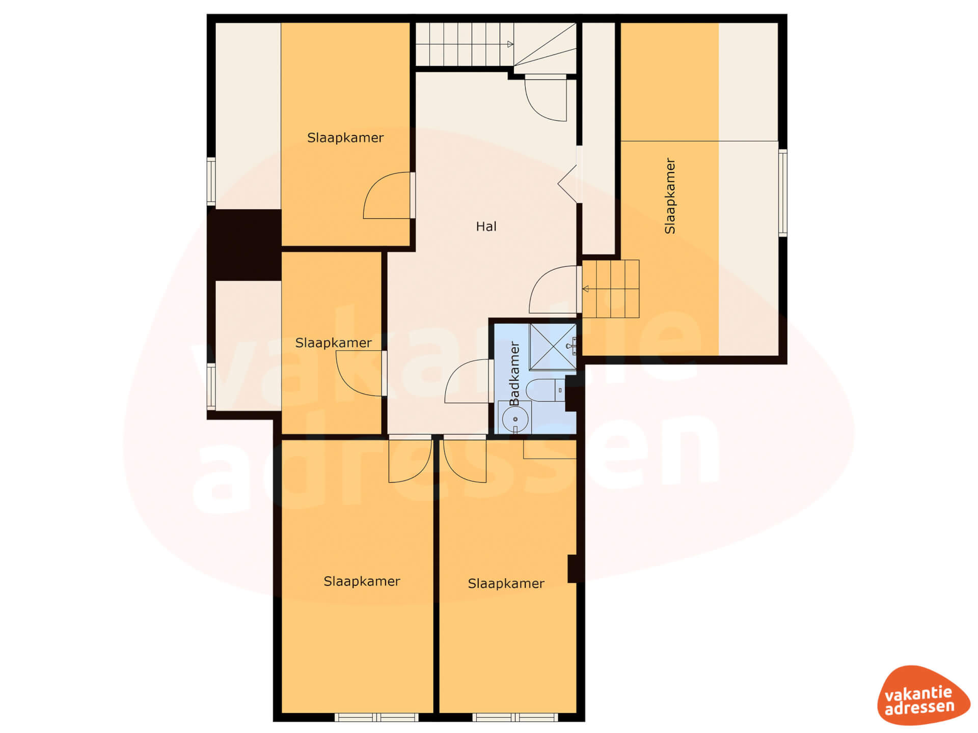 Op de begane grond zijn twee slaapkamers met 2-persoonsbedden, waarvan één met een kinderbedje. Verder is er een aparte toiletruimte en een badkamer met douche, bad, toilet en wastafel. De eerste verdieping heeft vijf slaapkamers en een badkamer met douche, toilet en wastafel. De slaapkamers verschillen in grootte en inrichting, waaronder een royale 2-persoonskamer en een gezellige kamer onder het schuine dak met twee 1-persoonsbedden, populair bij kinderen.