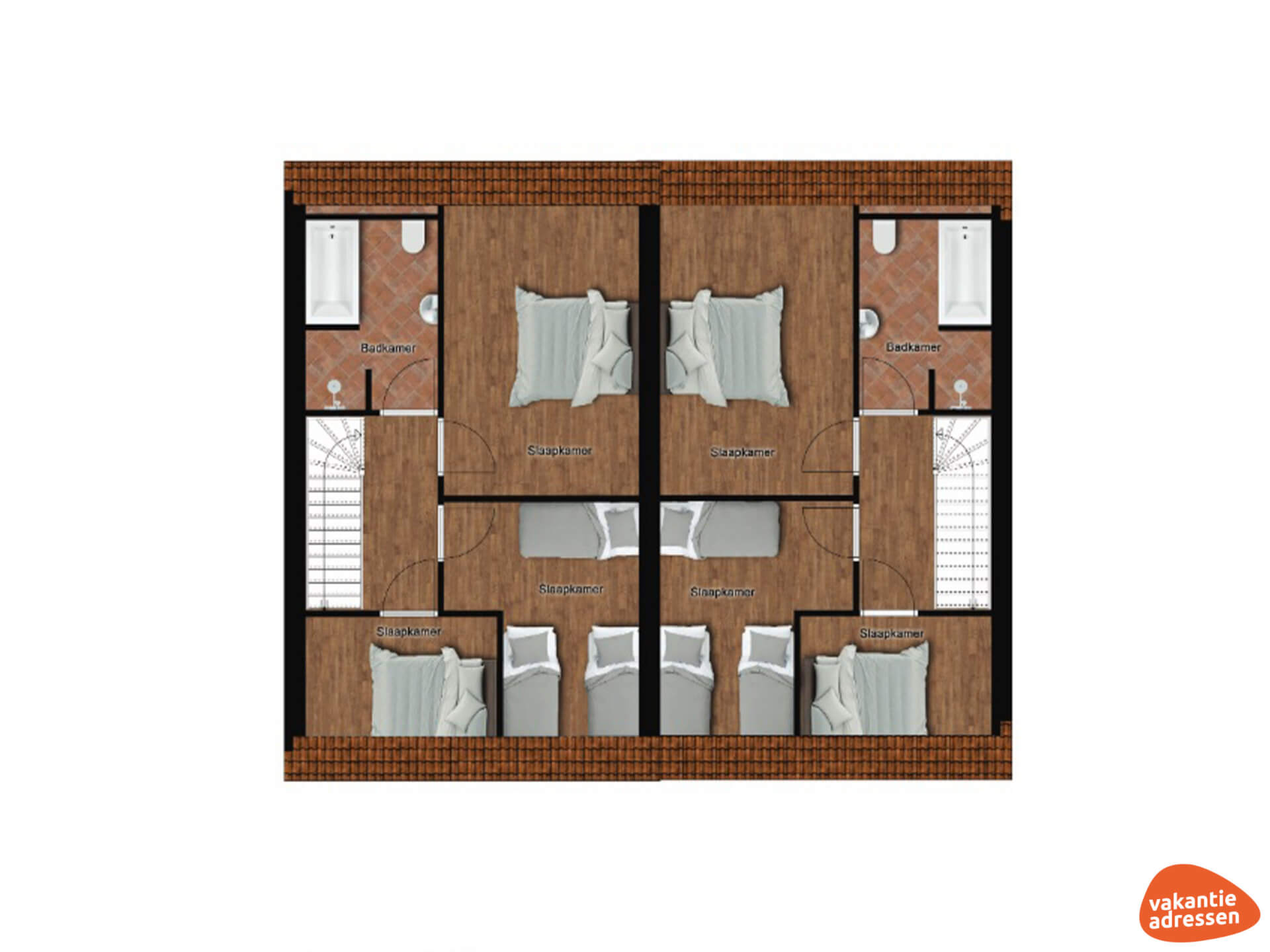 Op de bovenverdieping bevinden zich 6 comfortabele slaapkamers: 4 met elk twee 1-persoonsbedden en 2 met elk drie 1-persoonsbedden. Alle bedden zijn 90x200 cm en in twee kamers is een kinderbedje aanwezig. De 4 moderne badkamers -twee boven en twee beneden- zijn o.a. uitgerust met een ligbad, inloopdouche, toilet en wastafel. Alles is ingericht met oog voor detail en comfort. De badkamers op de bovenverdieping beschikken bovendien over een ligbad. Voor de kleintjes zijn er gratis voorzieningen beschikbaar, zoals een kinderbedje, kinderstoel, traphekje en stopcontactbeveiliging.