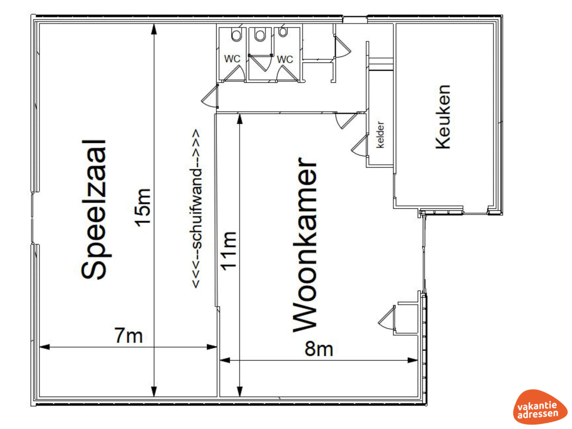 Op de begane grond bevindt zich het hart van het huis: een ruime horecakeuken en een grote zaal die door middel van een schuifwand kan worden opgesplitst. Hierdoor ontstaat een gezellige woonkamer aan de voorzijde en een aparte speelkamer aan de achterzijde. Samen koken, uitgebreid tafelen en lange avonden borrelen gaan hier moeiteloos samen. De speelkamer biedt volop vermaak met onder andere een biljart, pooltafel, tafelvoetbal, darts en een klautertoestel voor kinderen. Dankzij de moderne tv, muziekinstallatie, wifi en ethernetaansluitingen is dit ook een fijne plek voor bijeenkomsten of een verblijf bij minder goed weer. Op de begane grond zijn bovendien aparte dames- en herentoiletten aanwezig.