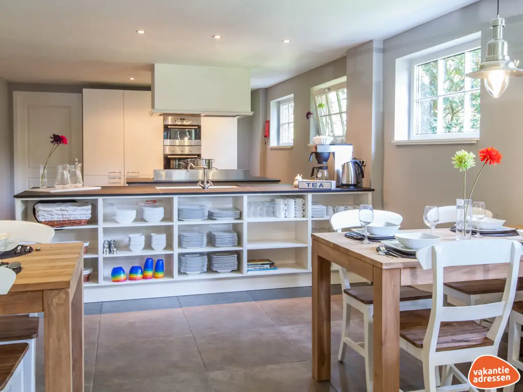 In de gezellige woonkamer zijn verschillende plekjes gecreëerd om te zitten. Op de grote banken kun je met een groepje rustig tv kijken, terwijl de rest aan de bar geniet van een vers getapt pilsje. Klets lekker bij met een kopje thee voor de sfeervolle haard, waar de kinderen veilig bij kunnen zitten, want het is een speciale haard met koudvuur. Aan de lange tafel is voldoende plek om met zijn allen een gezelschapsspel te spelen. Natuurlijk worden de kleintjes niet vergeten en is er voor hen ook een klein speelhoekje ingericht. De grote woonkeuken heeft alles om van het koken een feestje te maken. Er is een groot 6-pitsgasfornuis, een combi-magnetron, een heteluchtoven en 2 grote koelkasten met diepvriesruimte. Aan een van de vele tafeltjes kun je lekker van de maaltijd genieten, of deze nou zelf gemaakt is of gebracht door de catering, het is alsof je in een restaurant zit. In de woonkamer zit een grote glazen pui waar konijntjes achter leven! Vanuit je luie stoel kun je dus genieten van deze lieve diertjes.
