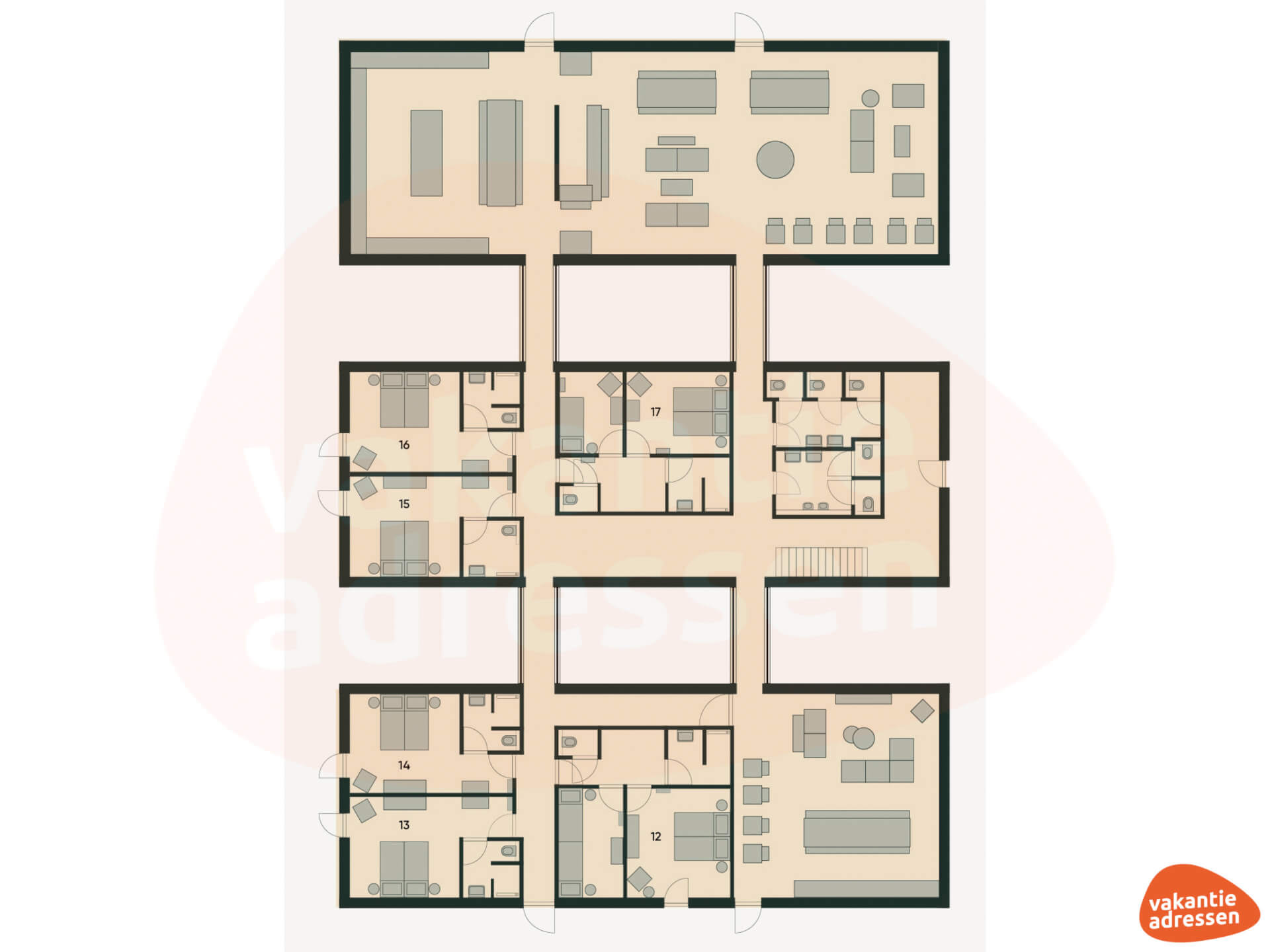 Gelegen nabij de Belgische grens vind je deze nieuwe luxe vergaderaccommodatie voorzien van vijftien 2-persoons slaapkamers met eigen badkamer, 8 kamers met elk twee aparte 2-persoons slaapkamers en 8 badkamers. Je huurt de gehele accommodatie welke bestaat uit 3 inpandige vakantiewoningen (15, 19 en 31-persoons). Iedere vakantiewoning heeft een gezellige leef- / vergaderruimte met zithoeken, eettafels en open keuken. De leefruimte in de grootste vakantiewoning op de begane grond is zeer ruim van opzet en biedt alle ruimte om met groepen tot 65 personen gezamenlijk te eten. De grote keuken beschikt over een volledig ingericht kookeiland. Vanuit deze leefruimte loop je zo de heerlijke tuin met overdekt terras in.