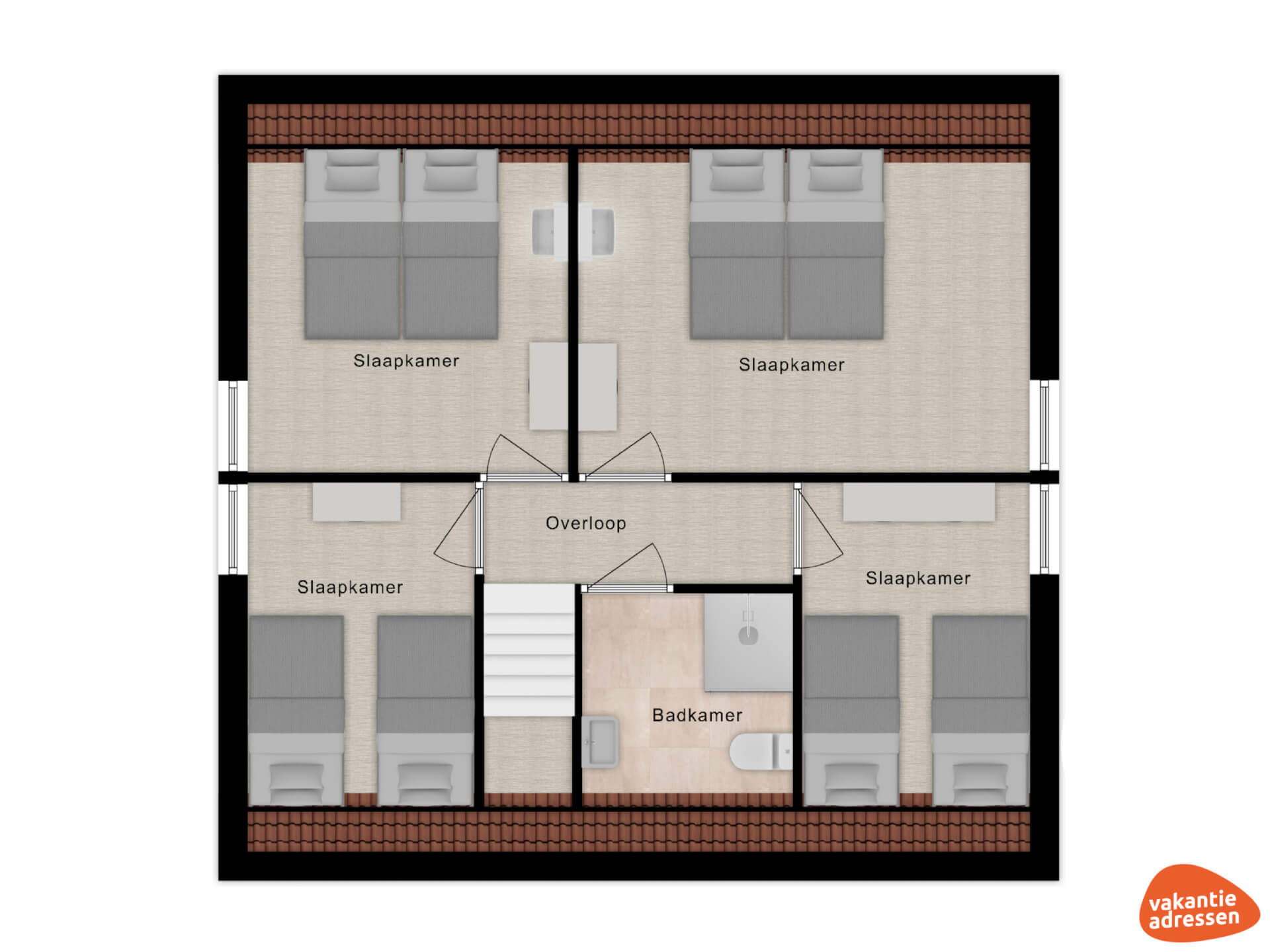 Op de verdieping bevinden zich 4 ruime slaapkamers, waarvan 2 slaapkamers voorzien zijn van een 2-persoonsbed en een eigen wastafel. De overige 2 slaapkamers zijn voorzien van 1-persoonsbedden. Voor de kleintjes is er een kinderbedje aanwezig. In de ruime badkamer bevinden zich een douche, wastafel en toilet.